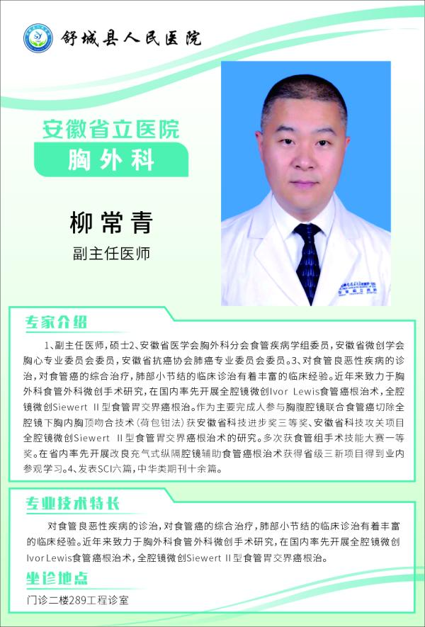 自2024年11月9日起,舒城县人民医院食管癌肺癌专病门诊正式开诊。每周六上午,省立医院胸外科专家在我院门诊二楼食管癌肺癌专病门诊坐诊,为患者提供精细化、专业化的诊治服务,欢迎有胸外科疾病的患者前来咨询和就诊。