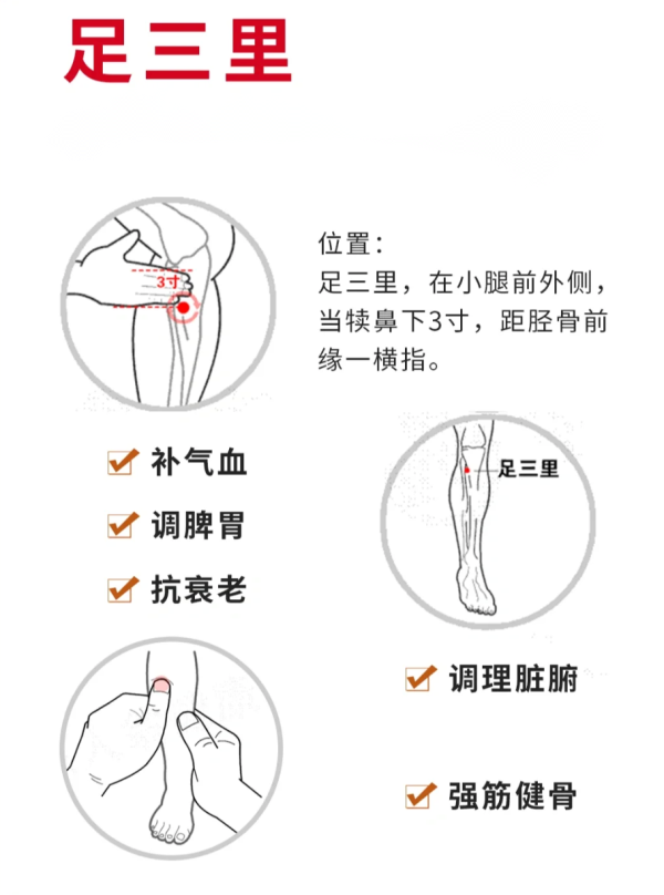 足三里(膝盖外侧凹陷下四指):