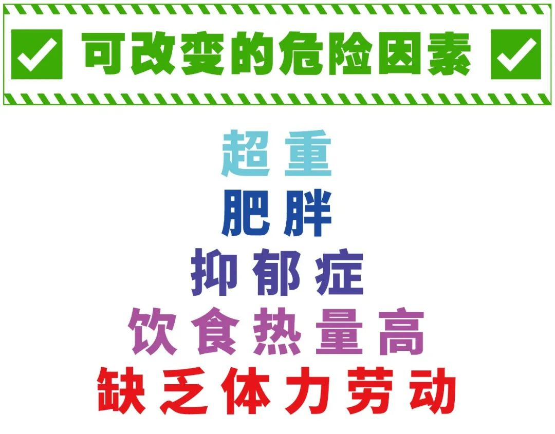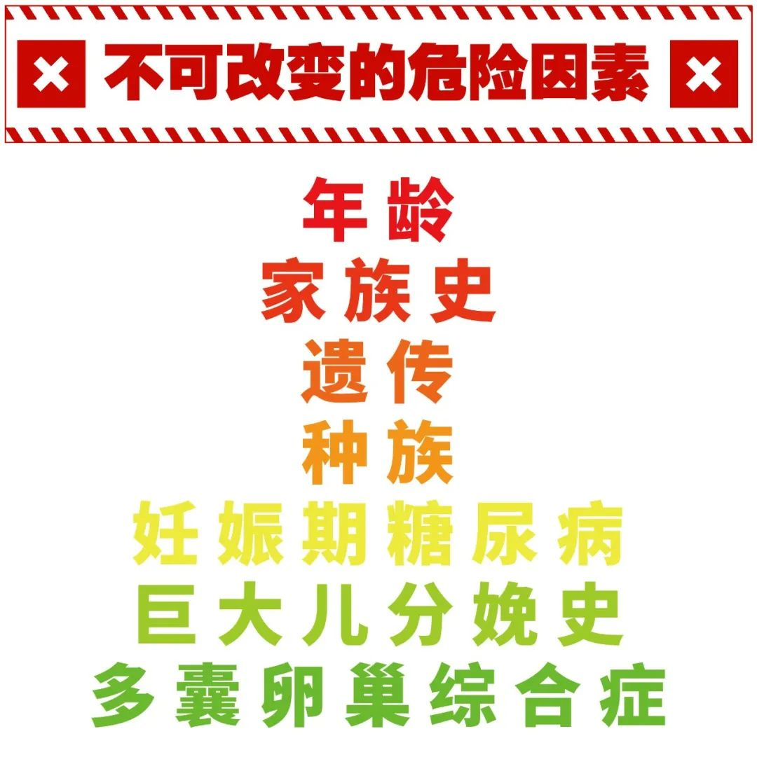 现在再回过头来看如何预防糖尿病这个问题。首先,对照以上的14条危险因素,如年龄、家族史或遗传、种族、妊娠期糖尿病或巨大儿分娩史、多囊卵巢综合症等是“不可改变的危险因素 ''而超重、肥胖、抑郁症、饮食热量高、缺乏体力劳动等是“可改变的危险因素”。