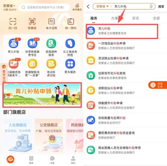 1.可通过“皖事通”APP、支付宝小程序进行申领。以“皖事通”APP为例,首页搜索“育儿补贴”或者点击轮播图进入服务。