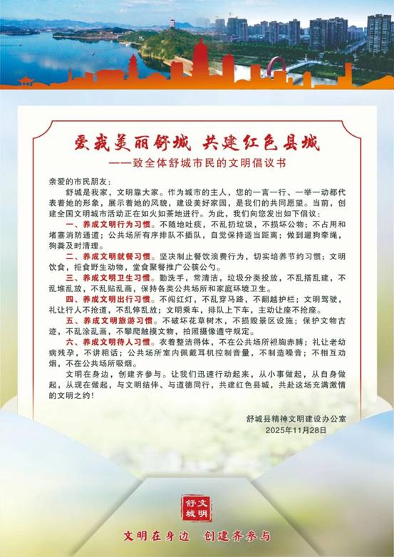 舒城是我家,文明靠大家。作为城市的主人,您的一言一行、一举一动都代表着她的形象,展示着她的风貌,建设美好家园,是我们的共同愿望。当前,创建全国文明城市活动正在如火如荼地进行。为此,我们向您发出如下倡议:一、养成文明行为习惯。不随地吐痰,不乱扔垃圾,不损坏公物;不占用和堵塞消防通道;公共场所有序排队不插队,自觉保持适当距离;做到遛狗牵绳,狗粪及时清理。二、养成文明就餐习惯。坚决制止餐饮浪费行为,切实培养节约习惯;文明饮食,拒食野生动物,堂食聚餐推广公筷公勺。三、养成文明卫生习惯。勤洗手,常清洁,垃圾分类投放,不乱搭乱建,不乱堆乱放,不乱贴乱画,保持各类公共场所和家庭环境卫生。四、养成文明出行习惯。不闯红灯,不乱穿马路,不翻越护栏;文明驾驶,礼让行人不抢道,不乱停乱放;文明乘车,排队上下车,主动让座不抢座。五、养成文明旅游习惯。不破坏花草树木,不损毁景区设施;保护文物古迹,不乱涂乱画,不攀爬触摸文物,拍照摄像遵守规定。六、养成文明待人习惯。衣着整洁得体,不在公共场所袒胸赤膊;礼让老幼病残孕,不讲粗话;公共场所室内佩戴耳机控制音量,不制造噪音;不相互劝烟,不在公共场所吸烟。文明在身边,创建齐参与。让我们迅速行动起来,从小事做起,从自身做起,从现在做起,与文明结伴、与道德同行,共建红色县城,共赴这场充满激情的文明之约!