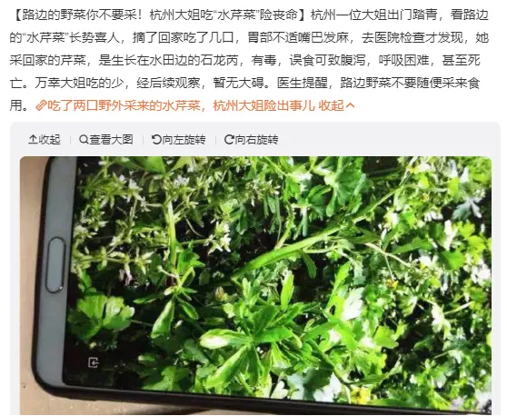 后经当地疾控部门确认,赵先生一家食用的野菜名叫石龙芮,长得很像水芹菜,含剧毒。误食后,口腔灼热,随后肿胀,咀嚼困难,剧烈腹泻,脉搏缓慢,呼吸困难,瞳孔散大,严重者会在10余小时内死亡。