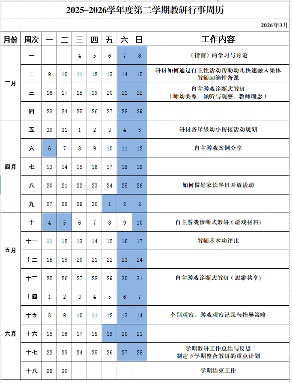 以《3-6岁儿童学习与发展指南》为核心,依托本学期教研行事周历,聚焦室内外自主游戏的深度推进,通过诊断式教研、案例分享、教师培训等方式,优化游戏环境创设、材料投放与观察指导策略,提升教师专业能力,促进幼儿在自主游戏中全面发展。