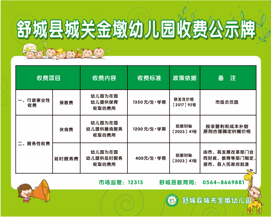 舒城县城关金墩幼儿园2025年度收费公示(收费项目、收费标准、收费依据、服务性收费、代收费收支情况、收费投诉电话)