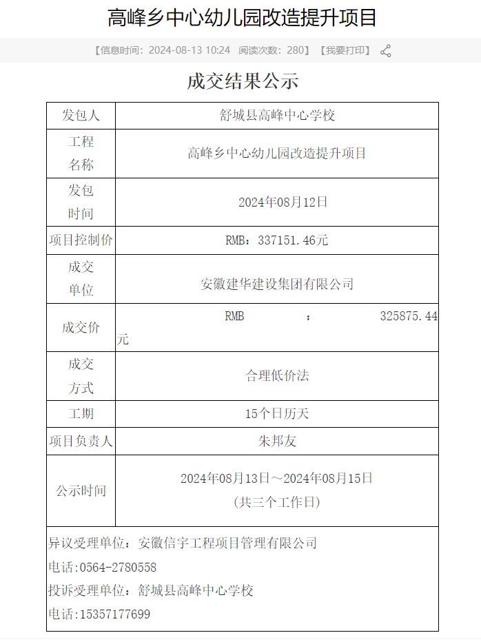 高峰乡中心幼儿园改造提升项目成交结果公示