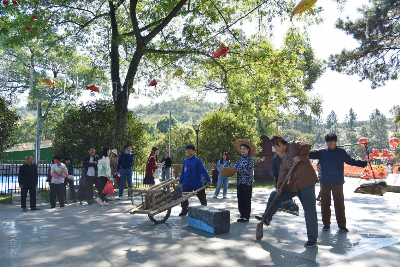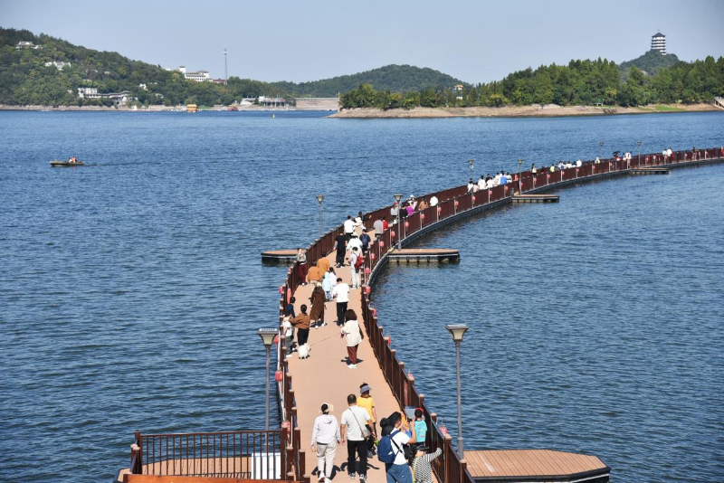 景区内的活动精彩纷呈,持续上新。坝前公园1960地雕为舞台,千米大坝为背景,演员们用舞蹈动作再现当年先辈们劈山引水的壮举;登临燕子岛,可与“百鸟仙子”一起装饰百鸟图,创意无限;漫步800米水上浮桥,与周瑜士兵一起赏金秋美景,体验沉浸式互动;周瑜岛读书楼“直中靶心”瞄准拉弓,看百步穿杨,更有戏台招亲,热闹非凡;龙王岛的国风之射“手疾眼快”潮玩互动,感受龙文化的独特魅力。