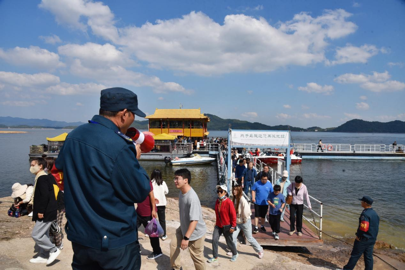 国庆假期第四天,天气晴好,秋高气爽,八方游客纷至沓来,万佛湖景区迎来客流高峰。景区在全力做好各项接待工作的同时,创优旅游环境,提升服务质量,以最佳的姿态敞开热情的怀抱,迎接四海宾朋。