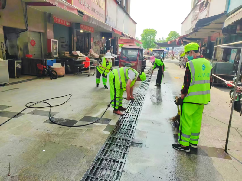 针对上述问题,环卫所迅速组织保洁人员展开全面清扫。他们手持扫帚、铲子、清洁剂等工具,对市场进行了彻底的清洁。特别是对于油污地面,保洁人员采用专业去污剂和高压水枪进行了反复擦洗,使地面恢复了原本的色泽;对于堵塞的排水沟,则用铁锹和高压水枪进行了疏通和冲洗,确保排水畅通。此外,对春秋农贸市场的公厕、水电设施、通风设备等也进行了全面检修和维护,确保了设施的正常运行。
