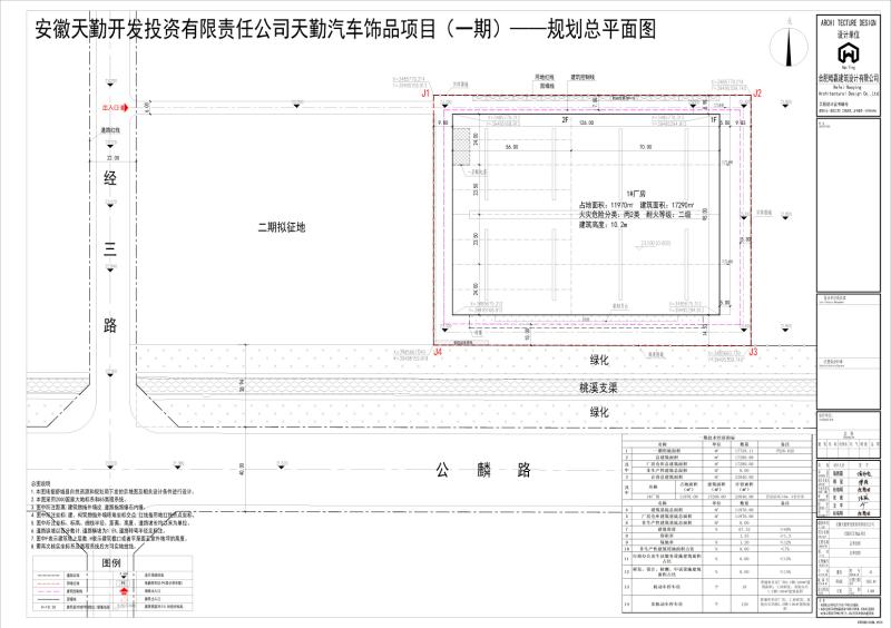 安徽天勤开发投资有限责任公司天勤汽车饰品项目(一期)用地位于安徽舒城经济开发区(城关片区)经三路与公麟路交叉口东北侧地块(具体位置见附图),规划总用地面积17728.11m2,规划计容总建筑面积23940m2。