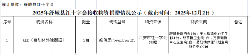 2025年舒城县红十字会接收物资捐赠情况公示(截止时间:2025年12月2日)