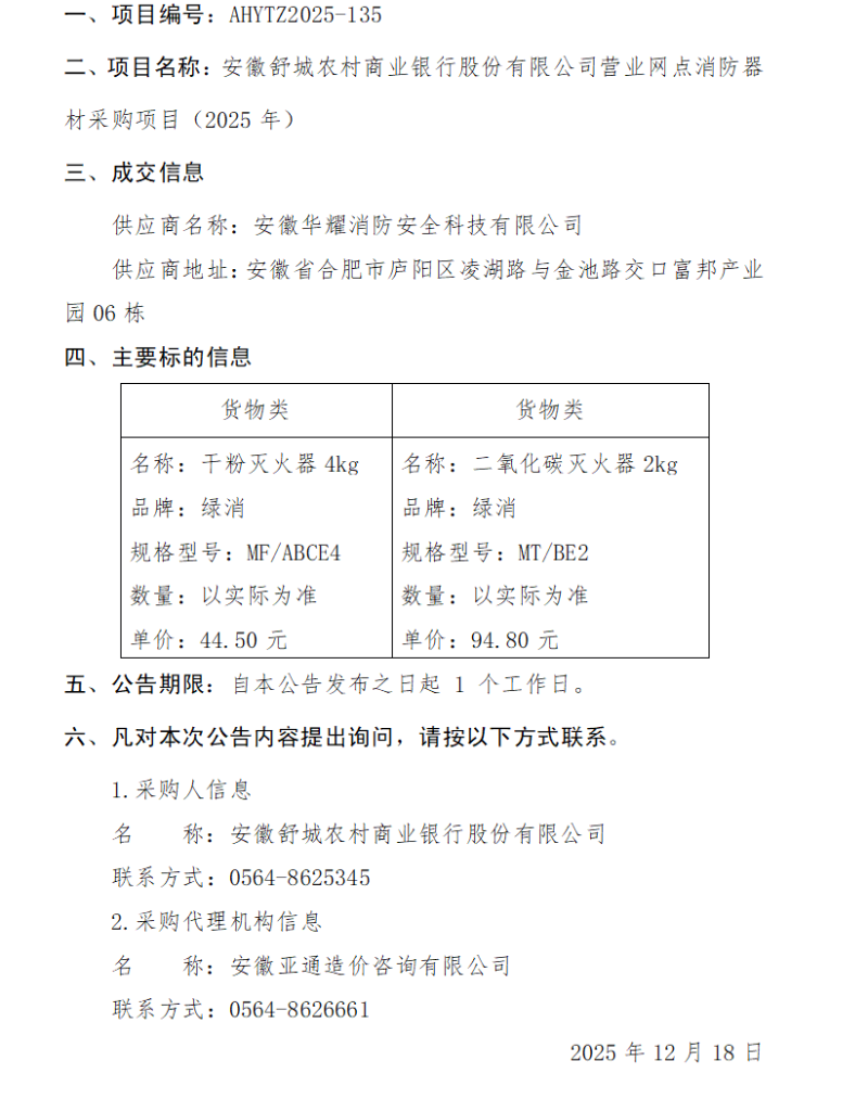 安徽舒城农村商业银行股份有限公司营业网点消防器材采购项目(2025年)成交结果公告
