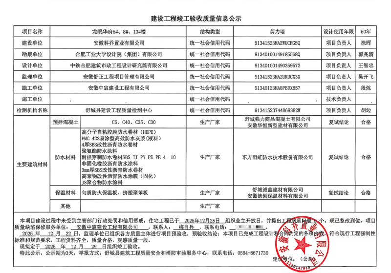 建设工程竣工验收质量信息公示(龙眠华府5#、8#、13#楼)