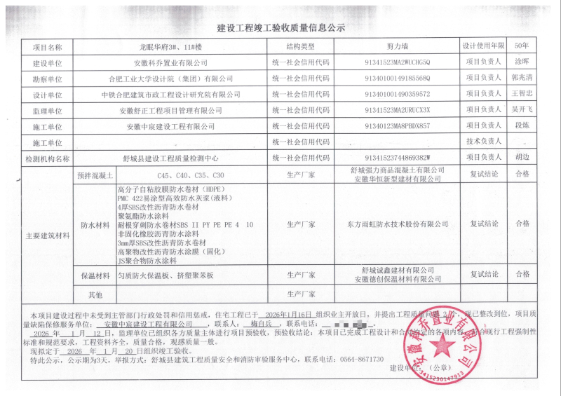 建设工程竣工验收质量信息公示(龙眠华府3#、11#)