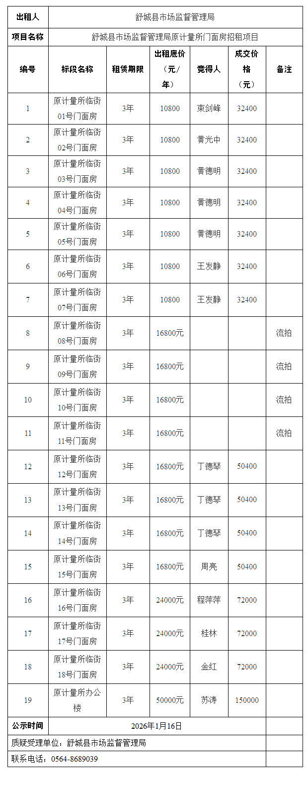 舒城县市场监督管理局原计量所门面房招租成交公示