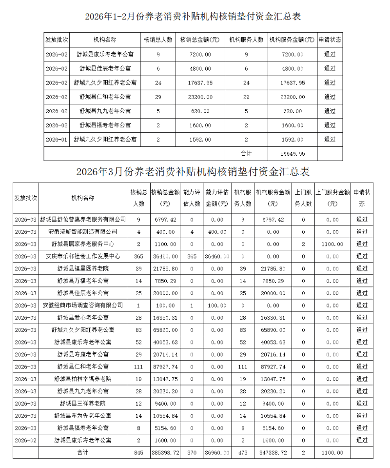舒城县1-3月养老消费补贴机构核销垫付资金汇总表