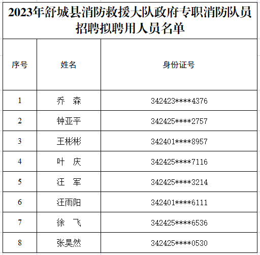 根据《2023年舒城县消防救援大队政府专职消防队员招聘简章》,通过报名、笔试、面试和资格复审,经研究,确定乔森、钟亚平、王彬彬等8名同志为舒城县消防救援大队政府专职消防队员招聘拟聘用人员,现将名单予以公示,公示时间为6月8日-6月10日。如对拟聘用人员持有异议,请于公示期间及时反映。
