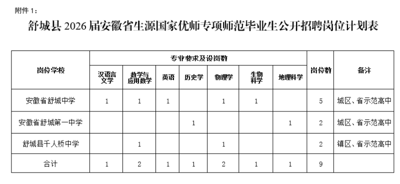 “优师计划”师范毕业生计划公开招聘9名。具体招聘岗位详见附件1:《舒城县2026届安徽省生源国家优师专项师范毕业生公开招聘岗位计划表》。