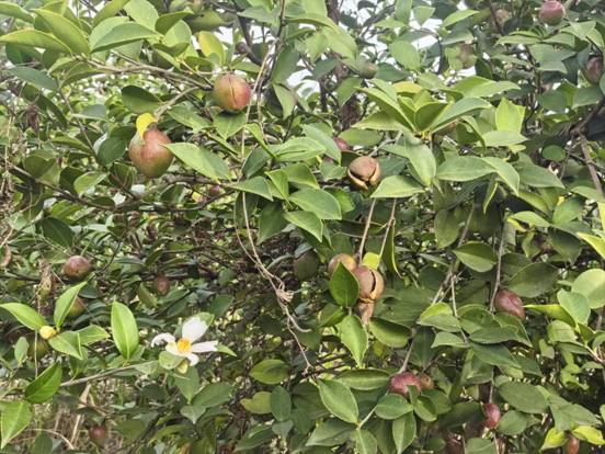 在油茶基地里,山坡上缀满了沉甸甸的油茶果,青的、黄的和红的,饱满圆润,陆续成熟。村民们忙碌地穿梭茶林,采摘油茶果,欢声笑语在林中穿透。