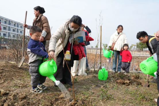 植树环节将活动推向高潮。大家分工协作、挥锹培土、扶苗浇水,亲手栽下一棵棵树苗,用双手播种绿色希望,以实际行动践行绿色环保理念,把发展中的青墩村装点的生机勃勃。家长和孩子们共同为小树苗挂牌,写下阅读寄语与成长心愿,将自然之美与书香情怀巧妙融合。