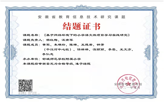 本年度,工作室成员积极参加教育教学课题研究,以科研促教学,推动学校信息化教学与学科教学的深度融合,不断提升专业能力。2019年10月,工作室成功申请立项了省级课题《基于网络环境下的微项目学习实践研究》(课题立项编号AH2019301),由工作室领衔人杨红梅、顾问汪南军老师主持,分设古诗词、对联、小古文、儿童诗、广告语等多个子课题组,进行了为期近2年的微项目学习实践研究。工作室所有成员都作为主要成员踊跃承担子课题任务,积极开展行动研究,撰写微项目学习教学方案、制作数字资源、搜集师生作品,在各自的子课题项目深耕细作,更出色地实现了自我成长,收获喜人。课题组共发表课题研究论文7篇,其中杨红梅的《基于网络环境下的微项目学习实践研究》《聚焦表达能力培养 整体架构单元教学》分别发表于《安徽教育科研》《语文报˙小语教研版》;黄军的《儿童诗教学的路径选择》发表于《安徽教学通讯》;朱琳玲、王德君的《微课,课堂教学的神助攻》《趣学文言文,课堂欢乐多》均发表于《安徽教育科研》;钟芳的《“精彩课堂不曾预约”——小学语文微课教学设计浅析》发表于《学习方法报》。2021年9月,该课题通过省级专家评审,顺利结题。