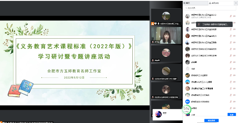 受合肥市方玉婷名师工作室领衔人方玉婷老师邀请,5月12日上午,方桂香工作室全体老师参加了方玉婷名师工作室组织的线上《义务教育艺术新课标(2022版)》研讨暨专题学习。