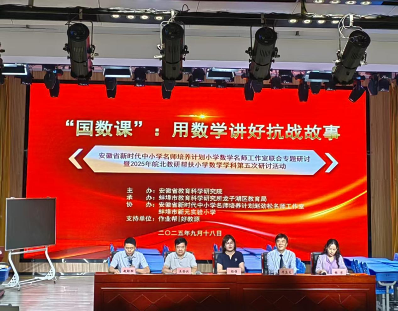 本次活动旨在全面贯彻党的教育方针,提升小学数学教师的课程育人意识与教学能力,发挥安徽省小学数学名师工作室的示范引领作用,深入推进课堂教育教学改革。恰逢抗日战争胜利80周年,活动联合全国著名特级教师华应龙团队,围绕“用数学课讲好抗战故事”这一主题,深入探讨将“国数课”打造为“大思政课”精致品牌的创新路径与实施策略,推动数学课程与思政教育深度融合。“国数课”由全国著名特级教师华应龙于2024年首创,是一种将爱国主义教育融入数学教学的新型教学模式,通过具有震撼力和说服力的数据与数字,强化学生的国家认同和爱国情感。