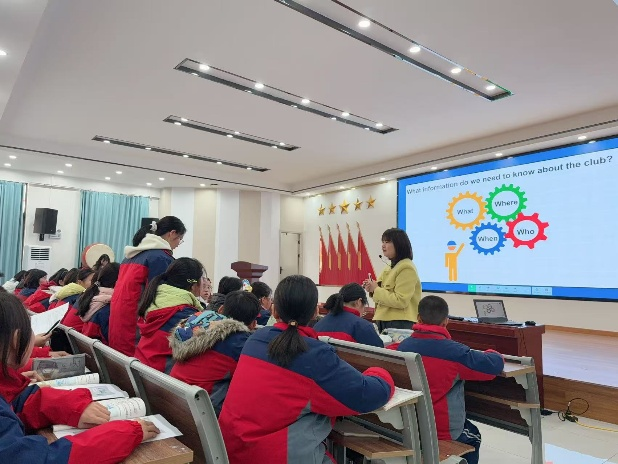 活动围绕“核心素养导向下的课堂变革”展开,工作室骨干教师呈现两节精彩示范课。夏彩霞老师基于人教版七年级上册第五单元内容,以“what-why-how”为思维主线,引导学生深入文本、迁移创新,完成“俱乐部主题海报”设计。课堂中贯穿多元评价,实现“教—学—评”一体化,获得观摩教师广泛好评。