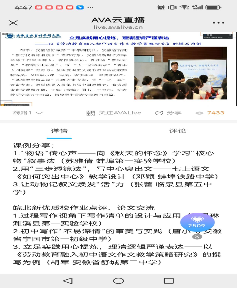 1月6日下午,安徽省教育科学研究院主办的皖北地区基础教育教研帮扶初中语文学科第七次研讨活动如期举行。活动采用线上直播形式,安徽省中学语文教研员谢发茹老师主持活动,近八千名一线教师线上观摩。安徽省新时代胡军名师工作室应邀做经验分享。