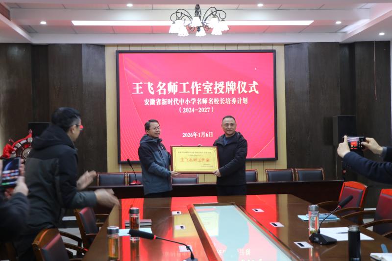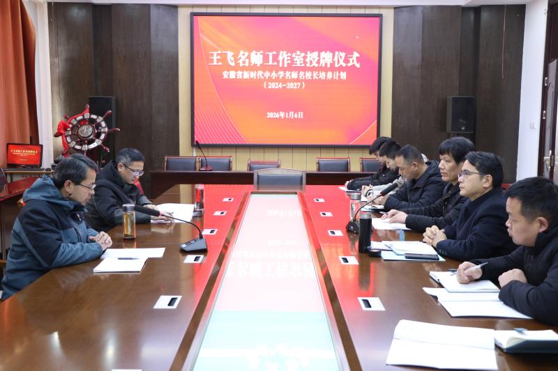 1月6日上午,安徽省新时代王飞名师工作室授牌仪式在千人桥中学春晖楼四楼会议室隆重举行。舒城县委教育工委委员、县教育局副局长汪泽雨一行出席仪式并为工作室授牌。千人桥中学校长王克胜、学校相关部门负责人及工作室成员齐聚一堂,共同见证这一重要时刻,活动由千人桥中学副校长黄金星主持。