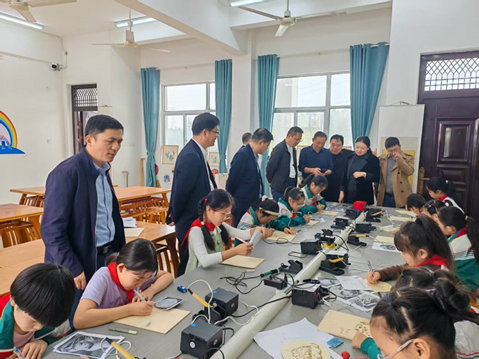 视导组到校后首先召开工作布置会,明确了本次教学视导工作的目标及内容,接着,视导组听取了该校党总支书记桂曙东的学校工作汇报。随后,视导组根据分工分别深入各年级、各学科随机进入教室听课,参观了学校的特色社团烙铁画和机器人、无人机社团。课间还观摩了学校的大课间活动,对初中的跑操和小学部的校园小舞台活动进行了充分肯定。