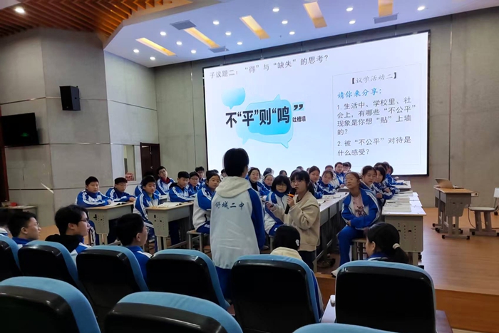 活动邀请舒城二中杭埠校区舒三初级中学杨玉雯老师和淮北市实验学校赵娜老师同上思政教材八年级上册《坚守公平》一课。两位老师分别采用议题式教学和“篇章式”的教学构思,用新颖独到教学设计和教学方法,引导学生学生理解和实践公平对个人和社会的价值。