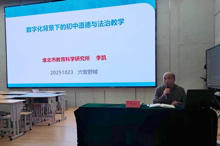 课后,淮北市教育局教研室中学政治教研员、特级教师李凯分别对两位老师的示范课进行了点评,并做《数字化背景下初中道德与法治教学》的专题讲座。讲座主从新兴信息技术与教学变革、数字化背景下的初中道德与法治教学、智能时代与教科研论文写作三个方面进行阐述,强调了AI技术在初中道德与法治学科教学实践中的运用。