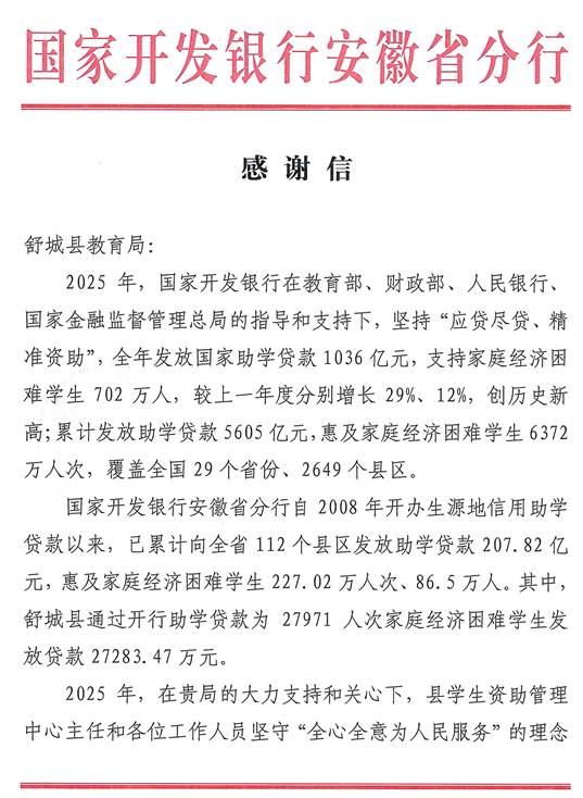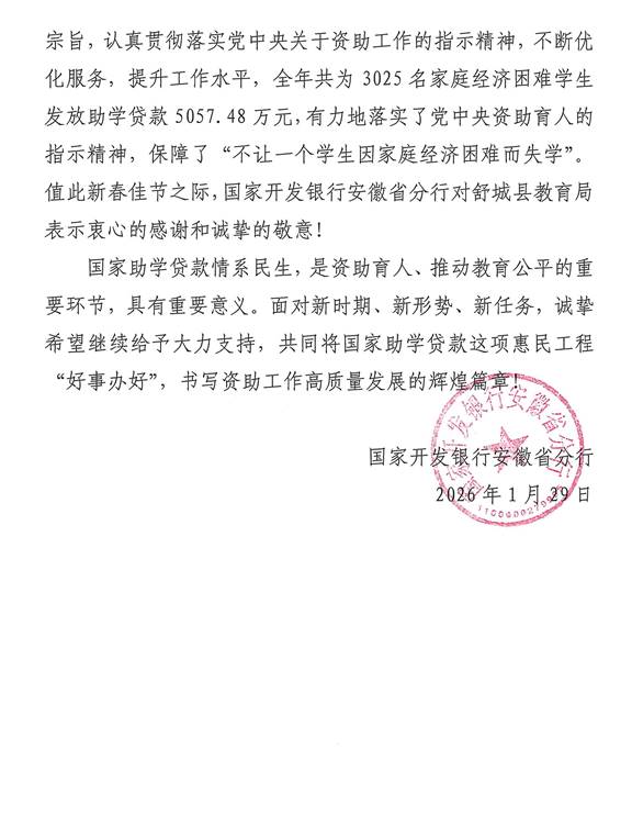 信中特别提到,舒城县2025年在县教育局的关心支持下,县学生资助管理中心工作人员坚守服务初心,不断提升业务水平,全年共为3025名家庭经济困难学生办理助学贷款5057.48万元,切实落实了“不让一个学生因家庭经济困难而失学”的政策目标。自业务开办以来,舒城县已累计通过国开行助学贷款支持27971人次,发放贷款27283.47万元,以务实举措为众多学子铺就了求学之路。
