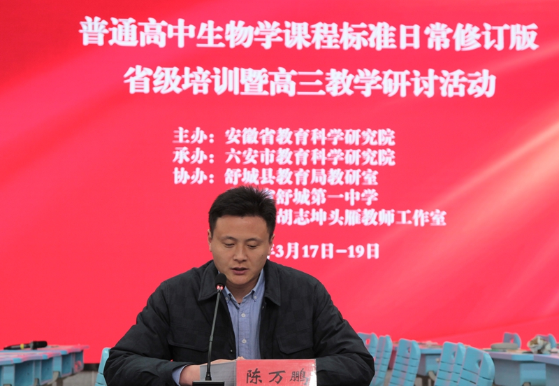 陈万鹏在致辞中对舒城一中及相关单位的保障支持表示感谢,强调了本次培训的流程架构与重要意义,祝愿参会教师学有所获、研有所得。