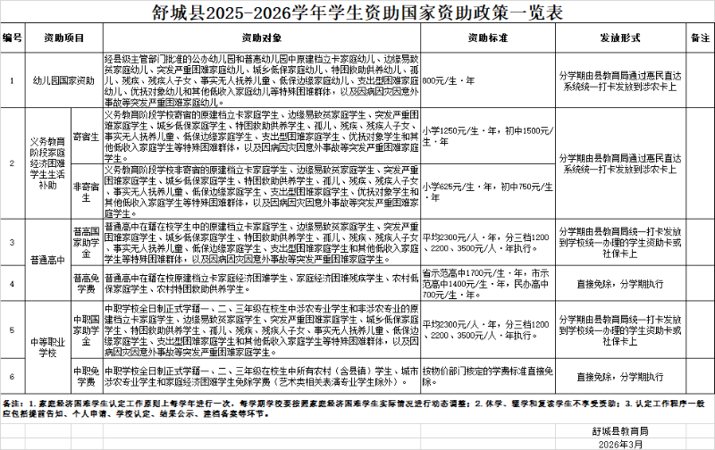 从学前教育到普通高中、中等职业教育,各项国家资助政策具体内容详见文末附表:《舒城县 2026 年春学期学生资助国家资助政策一览表》。