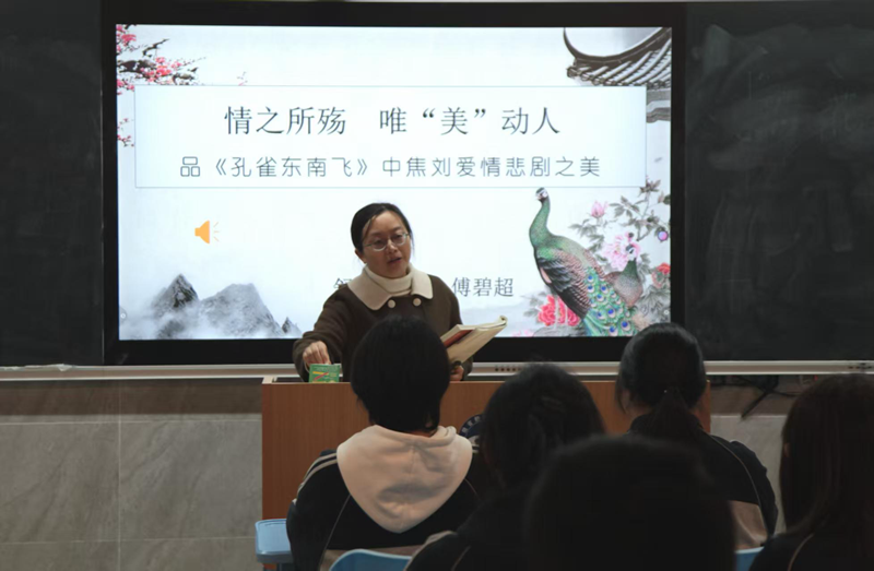傅碧超老师执教《情之所殇 唯“美”动人——品<孔雀东南飞>焦刘爱情悲剧之美》。课堂以鲁迅对悲剧美学的定义为主线,引导学生寻美、评美、悟美;通过分析人物形象,引领学生感受诗中的人物形象美、爱情美,理解焦柳爱情悲剧故事的美学意义,深化对古典文学悲剧美的理解。