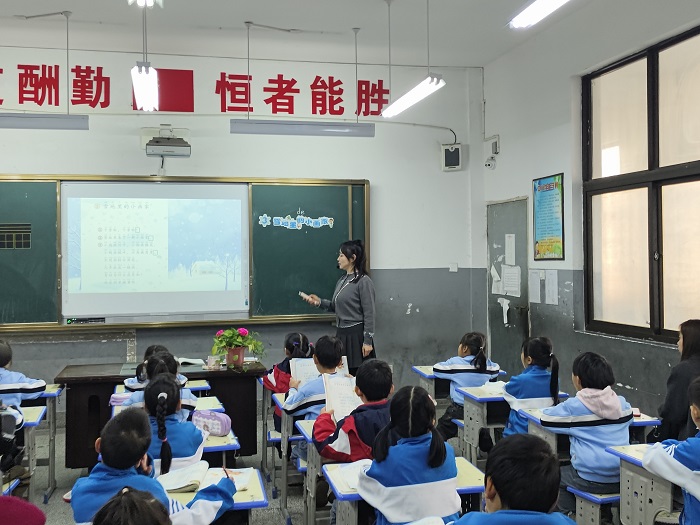 此次示范课分别由河棚镇中心学校的胡明珠老师和王传秀老师进行展示。第一节课是胡明珠老师执教,她的课题是《雪地里的小画家》,在课堂上,胡老师以“四季美景”主题情境导入,搭配多媒体课件中美丽的雪景,瞬间将学生带入银装素裹的童话世界,在教学过程中,她全程与学生积极互动,课堂节奏张弛有度,教学活动环环相扣,课堂氛围轻松热烈,孩子们在想象中与小动物们隔空互动,既轻松掌握了生字词,又在鲜活的语言场景中感受自然之美,悄然萌发热爱自然、亲近自然的情感。