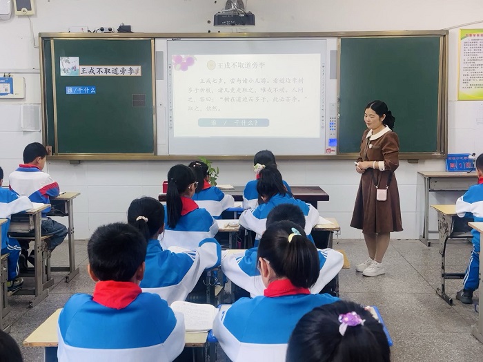 第二节课由王传秀老师执教,她的课题是《王戎不取道旁李》,王老师借课题入手,以“王戎为何不取李子”为悬念,先组织小组探究、逻辑推理,引导学生运用注释法、插图法、联系上下文等方法,帮助学生更好把握文章大意,在环环相扣的教学活动下,让学生进一步体会王戎的聪慧机敏,课堂氛围轻松活跃,最后的小组合作讲故事环节,更是将课堂推向高潮,激发了学生的学习兴趣,使他们更主动地参与到学习中去。