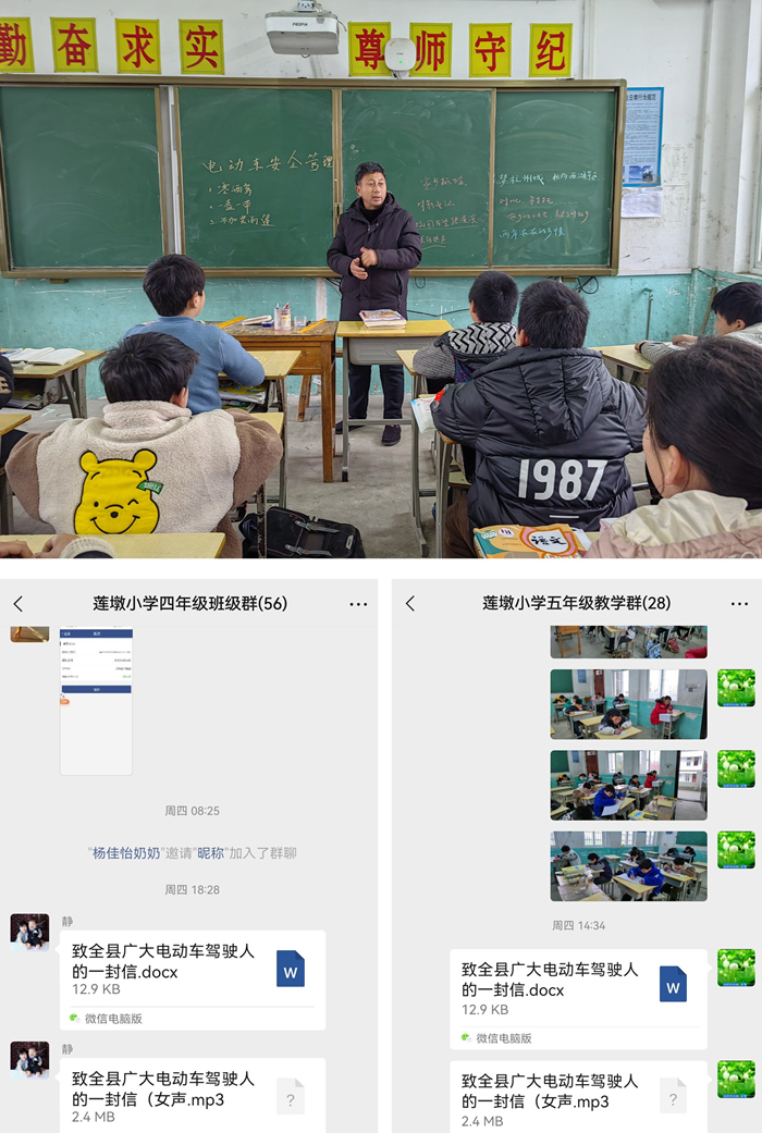 该校向学生发放了《致全县广大电动车驾驶人的一封信》,每位学生细听了《致全县广大电动车驾驶人的一封信》的音频,学校和教师签订了《安全承诺书》。通过宣传,学生知道:未满16周岁未成年人不能骑电动车;家长接送学生上学,家长和学生都要佩戴好安全头盔;严格遵守交通规则,红灯停,绿灯行;电动车不装雨棚、遮阳棚……