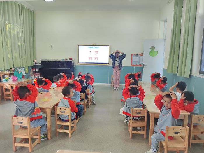 随着第一声警报响起,防震应急疏散演练正式开始,老师立即组织幼儿停止活动,以最快速度引导幼儿双手护头、降低重心,就近躲到墙角、桌下或支撑结构较多的空间,进行紧急避险;第二声警报响起,各班老师立即组织孩子们快速有序地撤离。