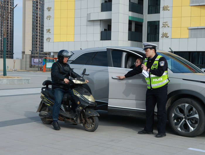 进入“教师电动车规范驾驶演示”环节。交警邀请学校保卫科科长董义明现场演示电动车正确佩戴安全头盔、遵守交通信号灯、礼让行人等规范操作。交警强调:“驾驶电动车时,驾乘人员必须全程佩戴安全头盔,后座不得搭载12岁以上人员,行驶中严禁接打手持电话。”