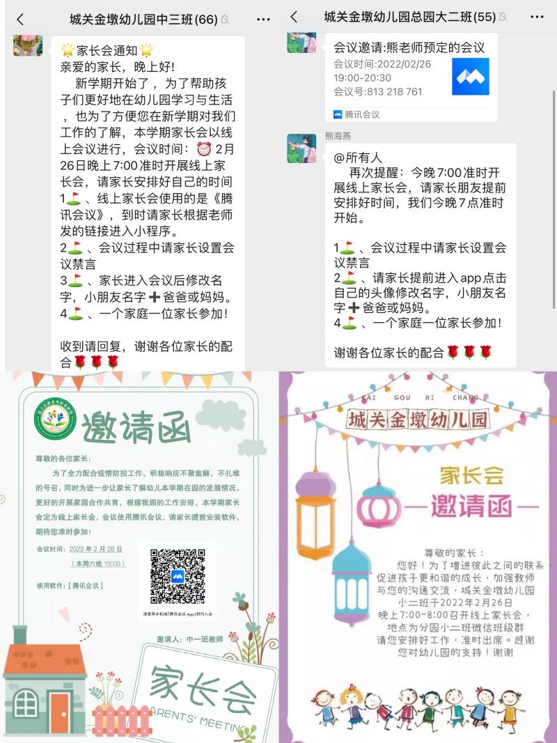 为了确保线上家长会的顺利进行,达到预期效果,在黄娟园长的统筹部署下,家长会召开之前,各班级老师向家长发送了线上家长会邀请函和通知,便于家长提前做好准备,保证线上家长会的顺利、高质量开展。老师们精心准备详尽的会议内容:提前录制孩子半日活动视频、拍摄在园生活照片、制作会议PPT……