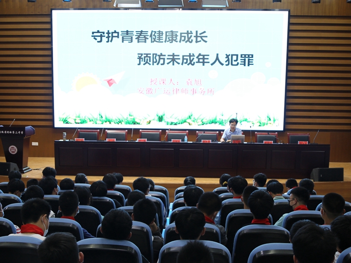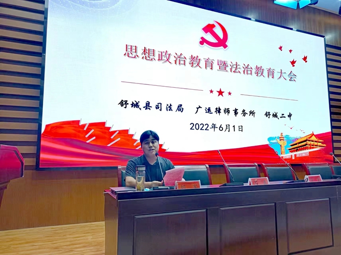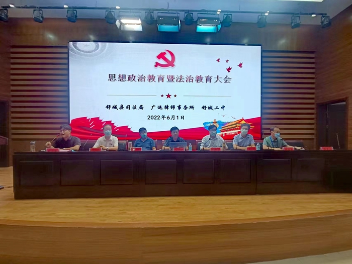 情暖“六一”,护航成长。为提高同学们的思想政治素质,增强同学们的法治意识,6月1日下午,舒城二中举行“思想政治教育暨法治教育”大会。大会邀请 “全国优秀党务工作者”郭世明同志、广运律师事务所袁旭律师为同学们做思想政治和法治教育报告。大会由政教处主任胡军主持。广运律师事务所黄光云主任、县教育局原关工委主任石磊、该校张春副校长等参加活动。本部八年级部分同学参加大会。