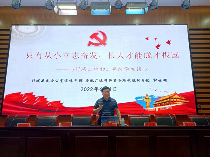 郭世明同志为同学们做了题为《只有从小立志奋发,长大才能成才报国》的思想报告。他分享自己的成长故事,现身说法,语重心长,告诉同学们:青春因奋斗而精彩,人生因拼搏而辉煌;分享舒城二中办学的卓越业绩,希望同学们珍惜在此名校学习的时光,努力学习,健康成长;分享他参加建党一百周年纪念大会现场聆听习近平总书记讲话的动人情景,分享习近平总书记对于青年的殷切期望,分享青、少年一代“请党放心,强国有我”的铿锵誓言。一个个故事,一件件分享,饱含深情,感人肺腑,激起了同学们的强烈共鸣和阵阵掌声。