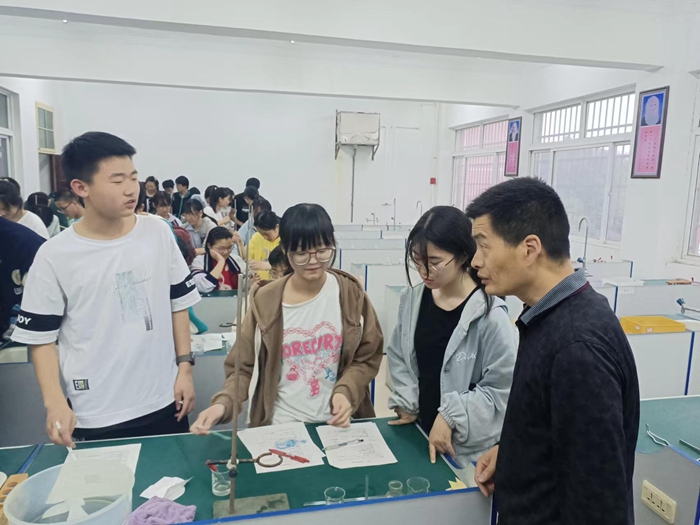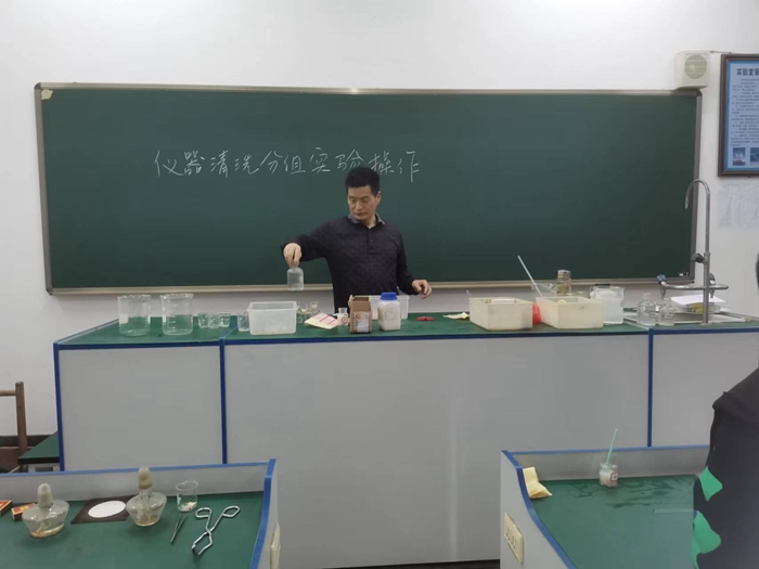 为保证安全和实验效果,实验课前,理化教师提前对药品、仪器和器材进行了认真检查和补充。随后制定了详细具体、切实可行的实验操作指导方案。课前为学生进行理论、操作规范和注意事项的讲解,学生认真听,认真记。实验中,班主任和实验教师通力协作。班主任维持秩序,做好服务保障;科任老师先演示实验操作,引导学生认真观察并进行思考,演示后要求学生按照示范进行实验操作,老师认真辅导学生,及时纠正错误,做好实验记录,总结得失,力争使学生都能规范操作。