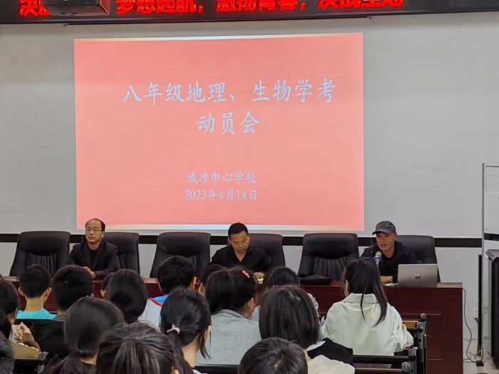 4月14日上午,城冲中心学校召开以“扬帆筑梦,迎战学考”为主题的地理生物学考考前动员大会。全体八年级学生、各班主任、地理生物学科老师齐聚多媒体教室,教务副主任崔小军主持会议。