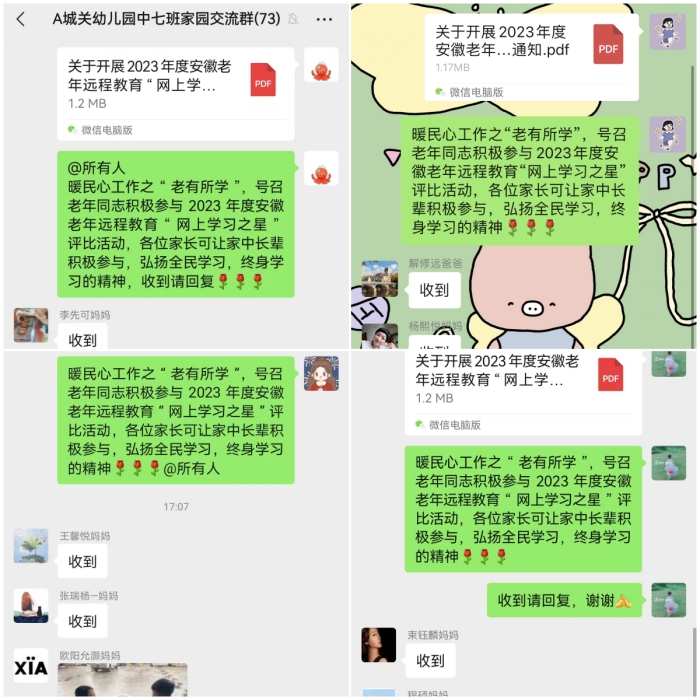 同时,各班通过家长群详细地向家长介绍“老有所学”工作,号召老年同志积极参与2023年度安徽老年远程教育“网上学习之星”评比活动,进一步推进智慧助老走向深入,让老年人在数字社会中有更多获得感、幸福感、安全感。