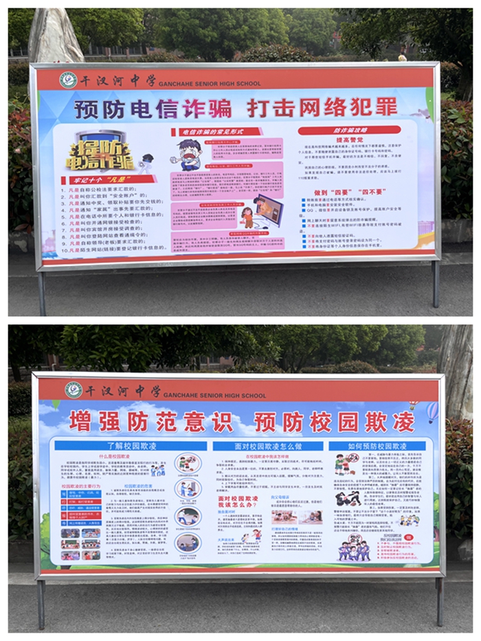 为进一步加强学校预防电信诈骗及校园欺凌宣传教育工作力度,增强师生自我防护意识,提高师生对基本电信诈骗方式和手段辨别能力,促进校园和谐稳定的发展,近日,干汊河中学多措并举,开展一系列预防电诈和校园欺凌主题教育活动。