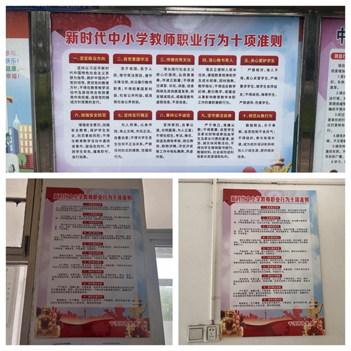 学校通过每个办公室张贴《新时代中小学教师职业行为十项准则》宣传栏,积极营造良好的学习氛围,让每个教师做到应知应做、必知必做,入心入脑,立行立效。各年级教师利用课余时间学习《十项准则》,结合学校工作情况,加强师德师风建设,引导全校教师时刻铭记职业行为准则和师德规范,严以律己,恪守职责,做一名无愧于人民教师。