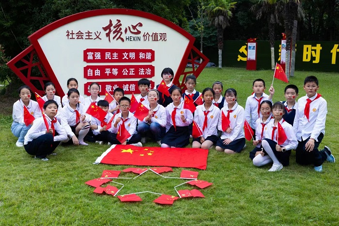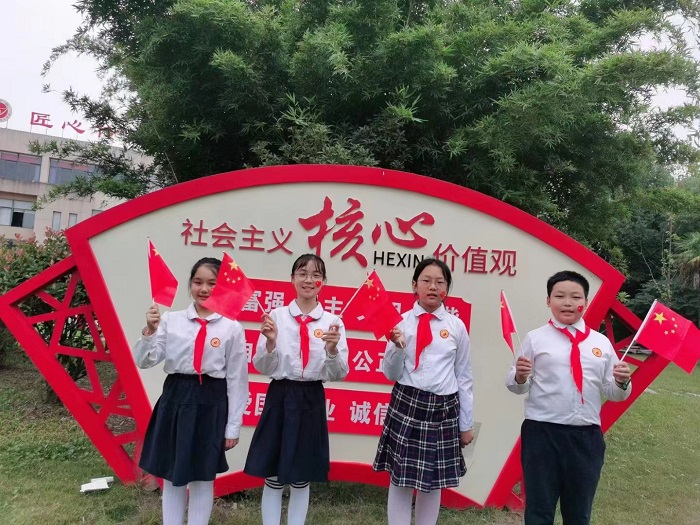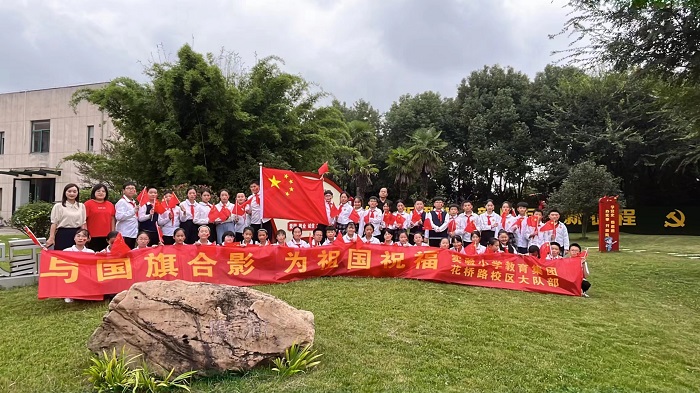 金秋九月,红旗飘飞,神州大地,繁花似锦。为庆祝祖国74周年华诞,加强爱国主义教育,传承红色基因,“扣好人生第一粒扣子”,9月26日下午,实验小学教育集团花桥路校区大队部组织六年级少先队员代表参加爱国主义教育实践活动——“与国旗合影,为祖国祝福”。